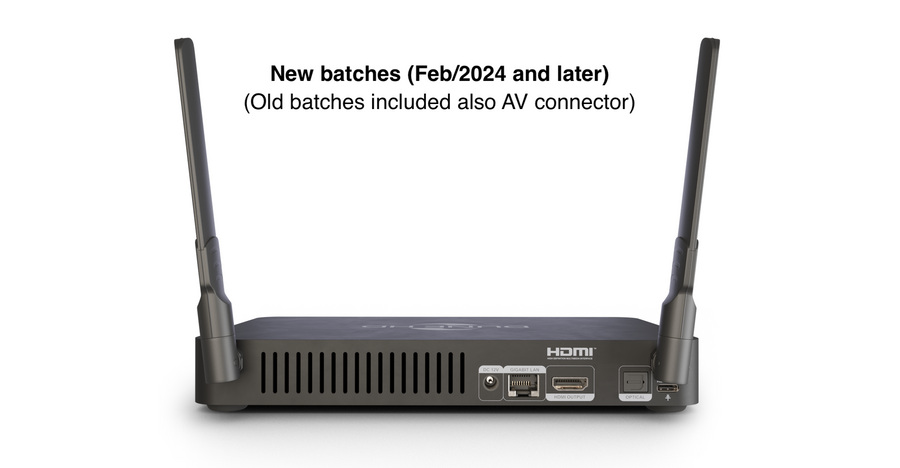 Analog A/V output: Absent in new batches (Feb/2024 and later), was present only in old batches: 3.5mm minijack (composite video + stereo audio)
